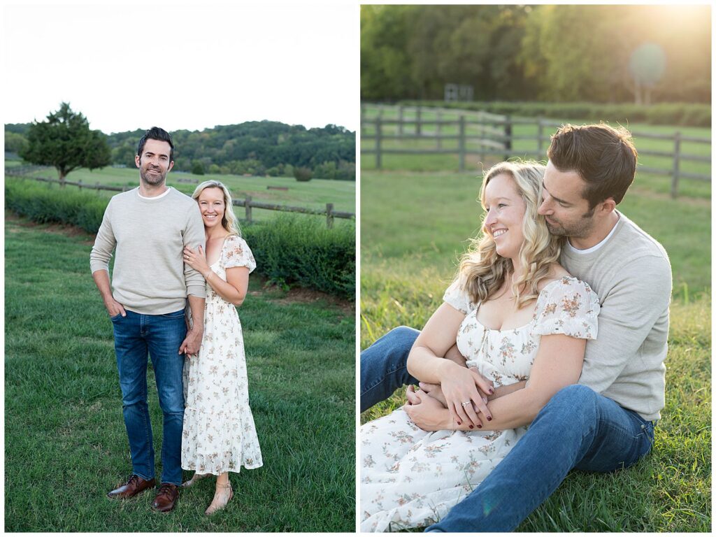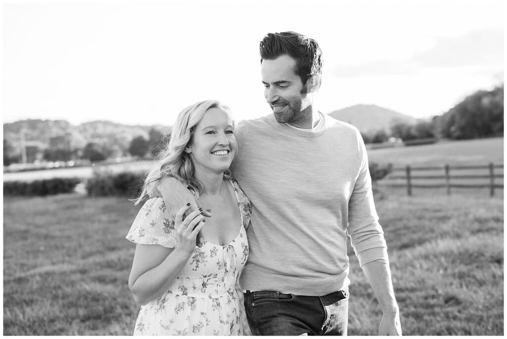 As the evening continued, we moved into the open fields and pastures near the Iroquois Steeplechase area, where the landscape opens up into wide green spaces and quiet countryside views. This part of Nashville has such a peaceful feel, especially as the sun begins to set behind the hills. The soft light, wooden fencing, and expansive fields gave the session a relaxed, romantic atmosphere that perfectly reflected the couple’s connection.