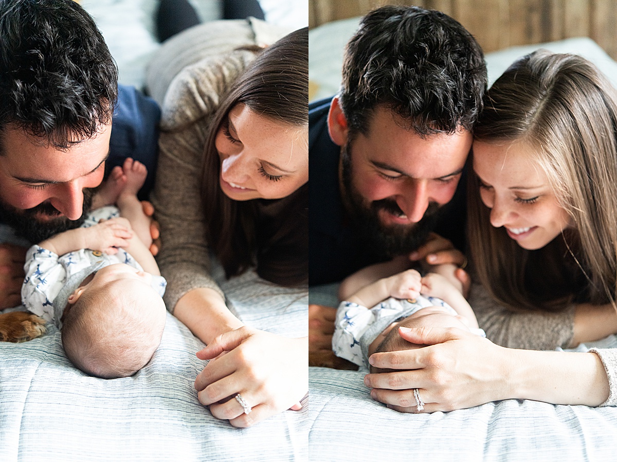 A quick shot of snuggles between mom, dad, and baby captured in the bedroom