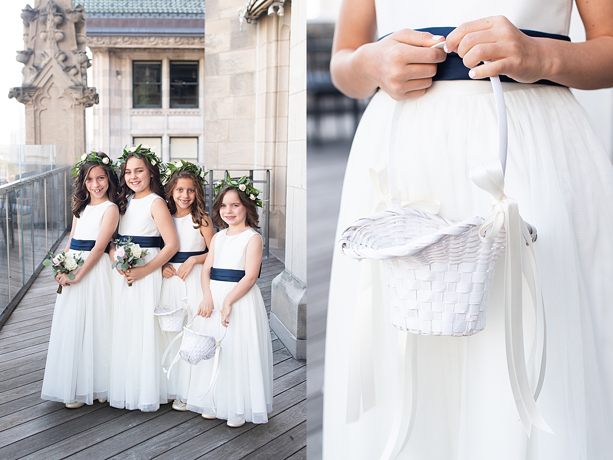 The flower girls boasted white dresses with navy blue sashes